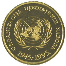 Motif on the reverse: the emblem of the United Nations, featuring a map of the world inscribed in a wreath consisting of stylised branches of the olive tree is placed centrally on the coin obverse. The numbers "1945-1995" are inscribed below the emblem. The inscription "ORGANIZACIJA UJEDINJENIH NARODA" is laid out circularly along the edge of the coin.