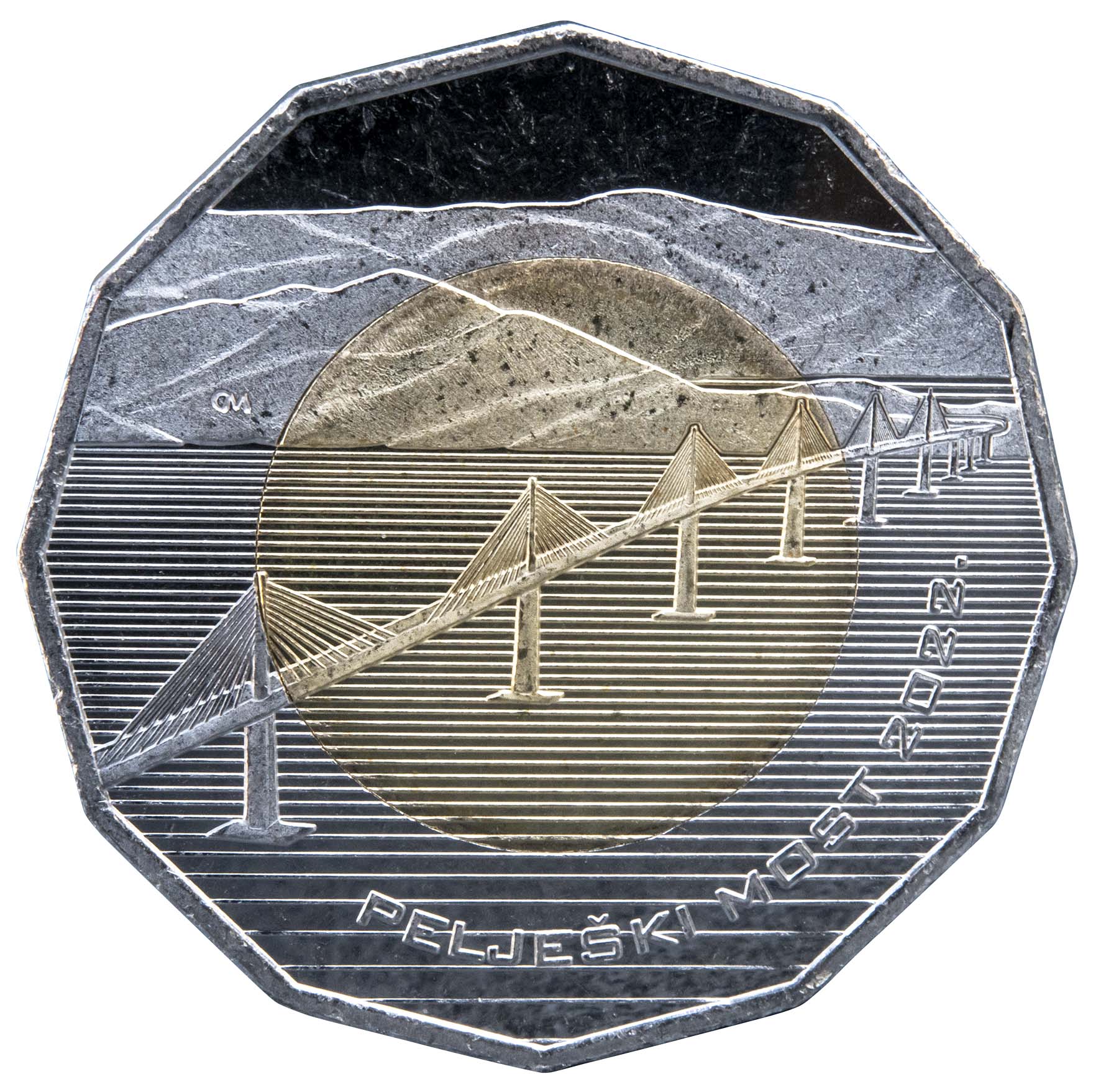 Motif on the obverse: the inner part of the core and part of the ring feature a presentation of the Pelješac Bridge. Partly in the inner part of the core and partly on the ring, behind the bridge, featured is a presentation of the part of the Pelješac peninsula that is connected by the bridge with the mainland of the Republic of Croatia. The inscription “PELJEŠKI MOST” (PELJEŠAC BRIDGE) and the year of release of the coin “2022” are positioned on the ring, below the presentation of the Pelješac Bridge.