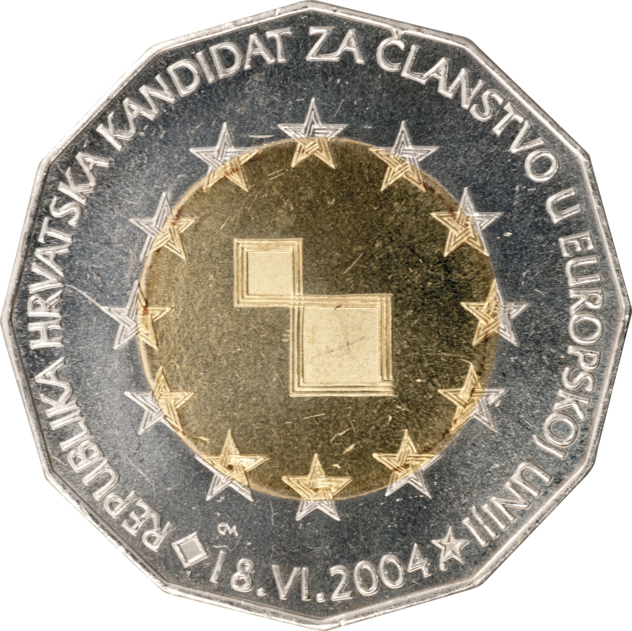 Motif on the obverse: the central part of the coin core features two squares symbolising the Republic of Croatia, placed one above the other with touching corners. The squares' edges, shown as if in motion, are formed by three lines, modelled after the Croatian wattle. The loose lines in the right upper corner of the lower bigger square are a symbol Croatia's openness towards the European Union. These lines stretch over to the coin ring embossed with twelve EU stars, which are interlaced by the Croatian wattle, as a symbol of Croatia's determination to become an integral part of the EU. Positioned centrally along the lower edge and bordered by a small square on the left and a small star on the right is the date "18 June 2004". The inscription "REPUBLIKA HRVATSKA KANDIDAT ZA ČLANSTVO U EUROPSKOJ UNIJI" continues from the date to the right, closing the circle on the coin.
