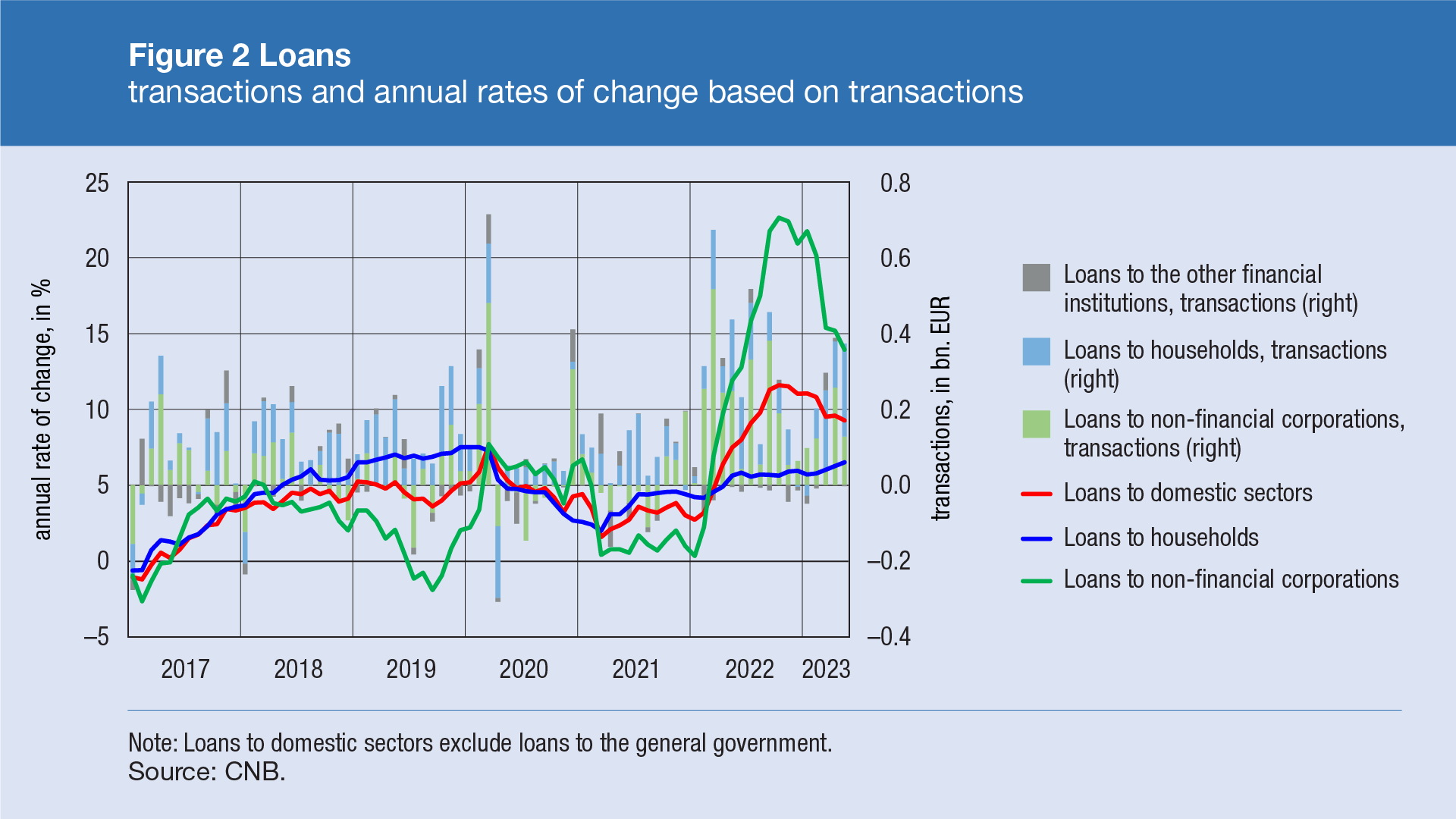 Total deposits of domestic sectors[1] rose very moderately in May reflecting the growth in overnight deposits of households and non-financial corporations. At the same time, time deposits of all domestic sectors decreased. Relatively strong credit activity continued in May, accompanied by a significant flow of new loans to households (in particular housing loans granted under the government subsidy programme) as well as to corporations, if at a weaker intensity of annual growth.