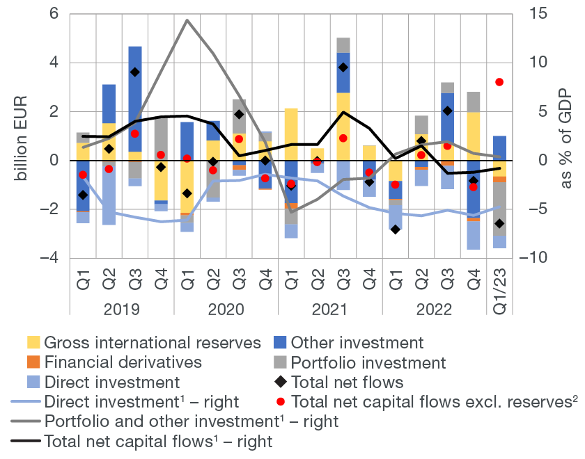 The financial account of the balance of payments recorded a net capital outflow of EUR 2.6bn in the first quarter of 2023, which is a decrease of EUR 0.2bn from the same period of the previous year (Figure 1b). In the first quarter of 2023, all sub-accounts of the financial account saw net inflows, except other investment, which recorded a noticeable net outflow. The latter was mainly a result of the increase in government foreign deposits based on the foreign deposit of funds raised by the issue of a national bond in early April to repay the ten-year US dollar bond from 2013. The strong net capital inflow in the account of portfolio investments was almost exclusively a result of the central bank's exceptionally strong divestment from foreign short-term securities, which, in turn, caused a noticeable increase in the CNB’s claims on the Eurosystem within the TARGET2 system, recorded in other investment. In addition, as a result of joining the euro area[1], CNB assets were redistributed from the reserve assets item to other foreign claims of the CNB so that the effect of the introduction of the euro on the central bank’s foreign position remained neutral. However, due to the changes in the methodology of classifying individual central bank positions and changes within functional categories related to the introduction of the euro, the scope of certain sub-accounts changed, so that, except for the sub-account of direct investment, they cannot directly be compared to the preceding periods. The net inflow of foreign direct investments is, by and large, a result of the increase in domestic corporate debt to affiliated creditors abroad and, to a lesser extent, of direct equity investment, primarily resulting from investments in the IT sector and real estate purchase by non-residents. The net inflow of foreign direct investments shrank noticeably from the same period in 2022 due to the increase in equity investments abroad of one pharmaceutical company. Due to aforementioned developments, over the past four quarters, the cumulative net inflow in the financial account dropped from 1.2% of GDP in 2022 to 0.8% of GDP in the period up to the end of March 2023.