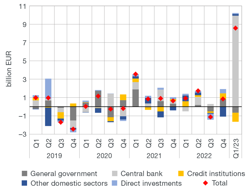 The current and capital account balance improved noticeably in the first quarter of 2023 relative to the same period in 2022, reflecting positive developments in all sub-accounts except in foreign goods trade. Accordingly, net capital inflow in the financial account decreased slightly from the same period in 2022.