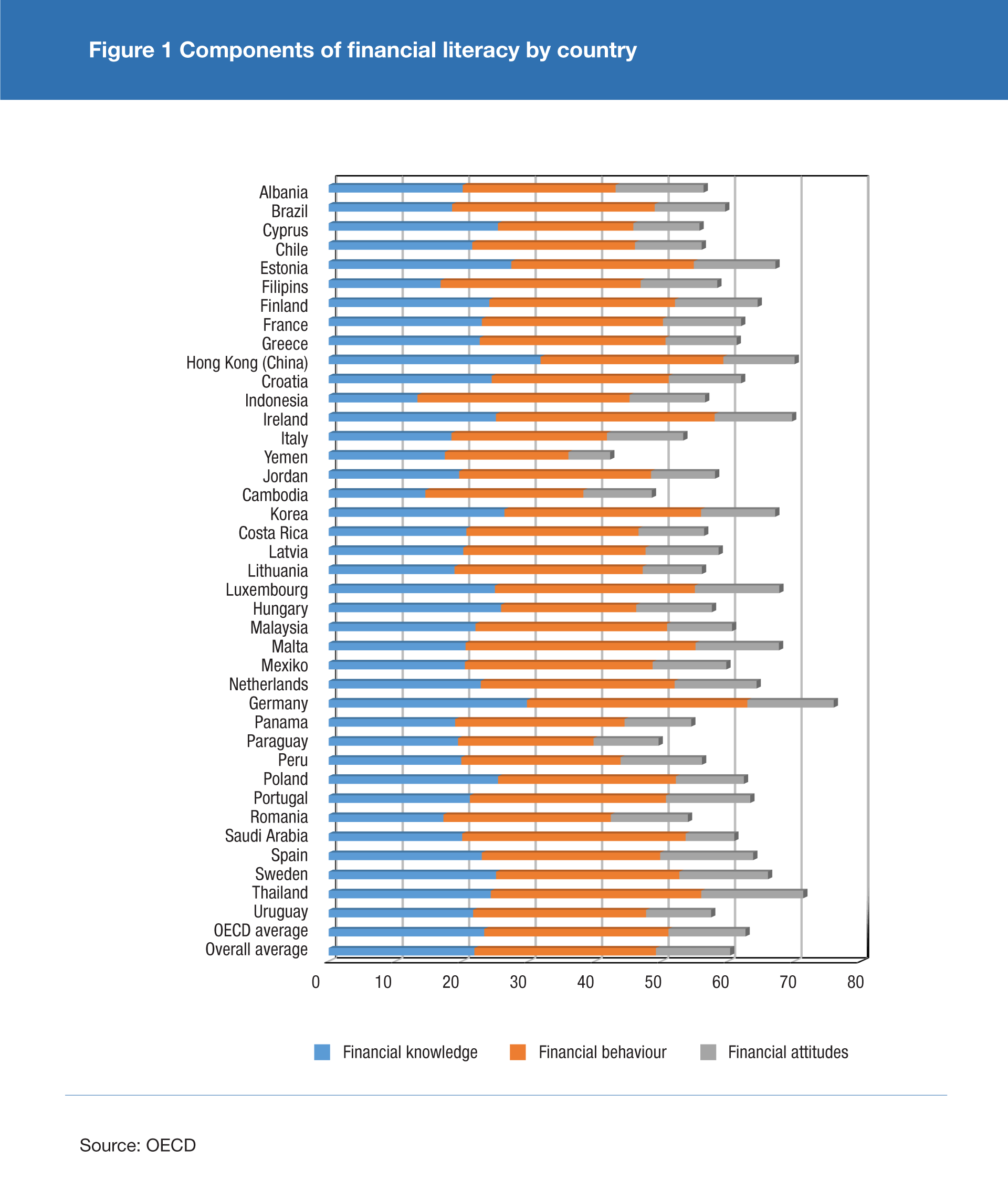 Across all participating countries, the highest level of financial literacy is among the citizens of Germany (76%). Among the EU member states, the citizens of Italy showed the lowest level of financial literacy (53%), while the lowest level across all participating countries was achieved by the citizens of Yemen (42%).