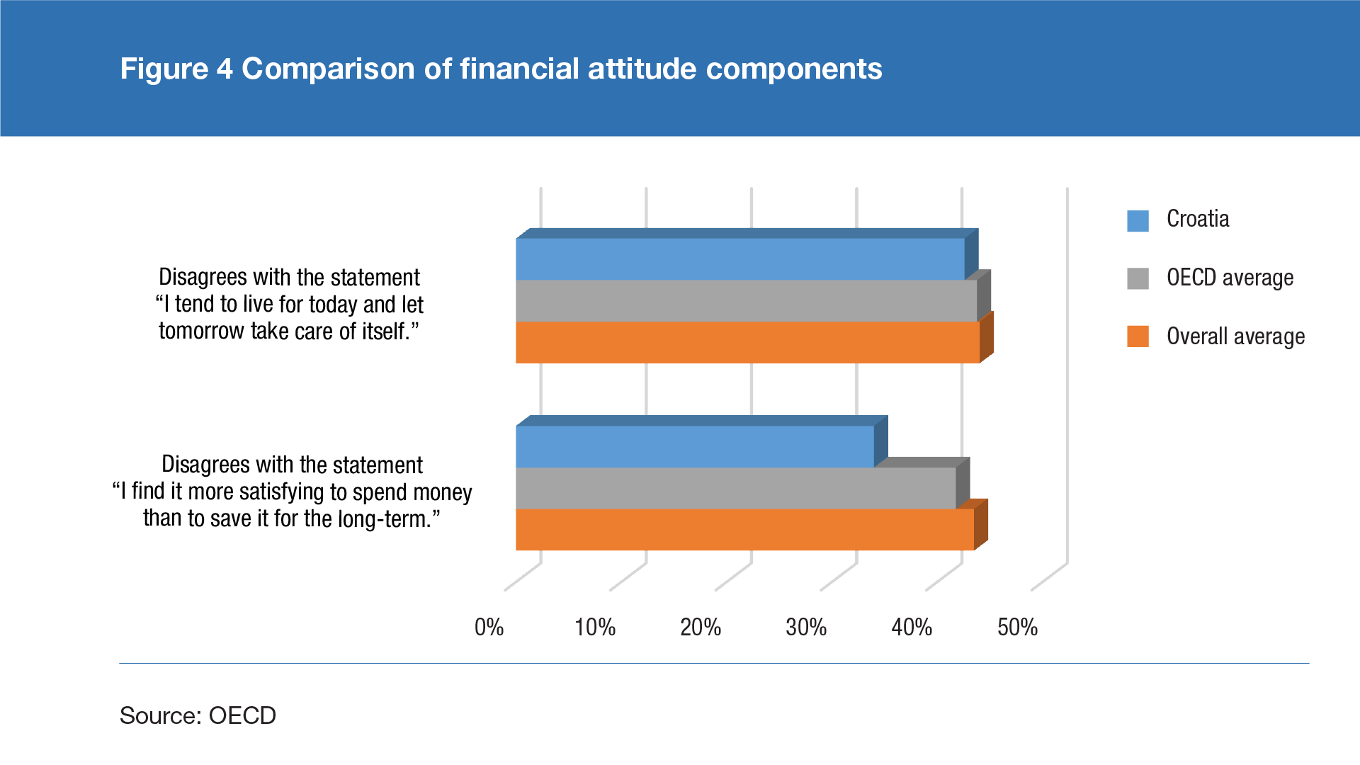 Financial attitudes show that a significant number of Croatian citizens still give preference to spending over long-term saving (Figure 4). It is also the only component of financial literacy within which the achieved scores on all questions are lower than the average of the participating countries and the OECD average.