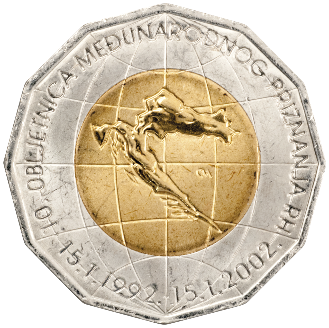 Motiv na licu: U središnjem dijelu jezgre kovanog novca prikaz je reljefa Republike Hrvatske, preko kojeg su istaknute vodoravne i okomite blago zaobljene linije koje simboliziraju paralele i meridijane planeta Zemlje, tvoreći prikaz pojave Republike Hrvatske kao samostalne države na svjetskom globusu. Centralno, uz donji rub, istaknuti su datumi »15. 1. 1992. - 15. 1. 2002.«. U nastavku istaknutih datuma, zatvarajući krug na kovanom novcu, s lijeve na desnu stranu, ispisan je tekst »10. OBLJETNICA MEĐUNARODNOG PRIZNANJA RH«.
