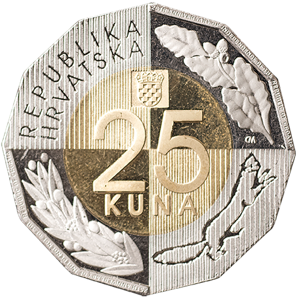 Motiv na naličju: u središnjem dijelu jezgre kovanog novca nalazi se ispisana u pozitivu brojčana oznaka nominalne vrijednosti »25«, a iznad brojčane oznake prikaz je grba Republike Hrvatske. Ispod brojčane oznake ispisan je u pozitivu naziv novčane jedinice »KUNA«. Ploha kovanog novca posebnom tehnikom kovanja razgraničena je na četvrtine od kojih su dvije, jedna nasuprot drugoj, matirane i ispunjene tankim okomitim linijama. Druge dvije četvrtine, jedna nasuprot drugoj, sjajnih su površina. U gornjoj lijevoj matiranoj četvrtini, na prstenu kovanog novca, ispisan je u negativu natpis »REPUBLIKA HRVATSKA«, a na suprotnoj donjoj četvrtini prstena prikaz je, u negativu, tijela kune zlatice okrenute u desno. U donjoj lijevoj sjajnoj četvrtini, na površinu prstena, položena je matirana grančica lovora u cvatu, a na suprotnu sjajnu četvrtinu položena je matirana grančica hrasta lužnjaka s plodovima. Na rubove prstena, donje i gornje četvrtine sjajnih površina ispisan je minipismom u negativu tekst »25TH ANNIVERSARY OF INDEPENDENCE OF THE REPUBLIC OF CROATIA«.