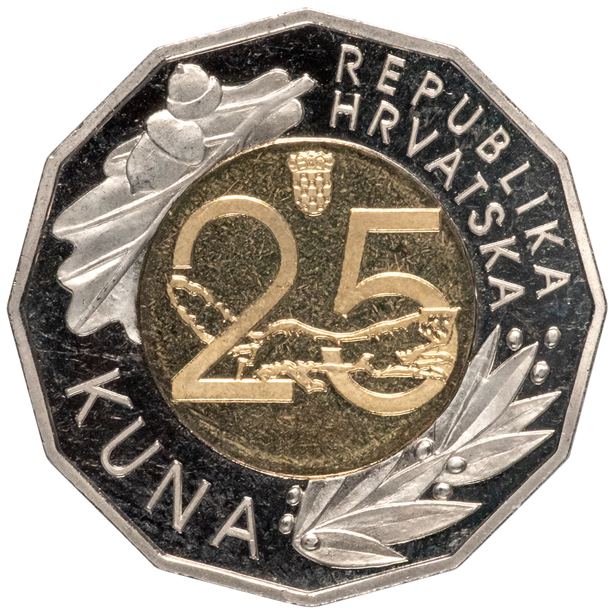 Motiv na naličju: u središnjem dijelu jezgre kovanog novca nalazi se ispisana brojčana oznaka nominalne vrijednosti »25«, kroz konture brojčane oznake vidi se kuna zlatica okrenuta nadesno, a njezino je tijelo ukomponirano u brojčanu oznaku. Iznad brojčane oznake i prikaza kune zlatice prikaz je grba Republike Hrvatske. Lijevo, iznad brojčane oznake, na površini prstena kovanog novca položena je grančica hrasta lužnjaka s plodovima. Desno, iznad brojčane oznake, na prstenu kovanog novca, ispisan je natpis »REPUBLIKA HRVATSKA«. Lijevo ispod brojčane oznake, unutar prstena kovanog novca, ispisan je naziv novčane jedinice »KUNA«. Desno ispod brojčane oznake, na površini prstena, položena je grančica lovora u cvatu.