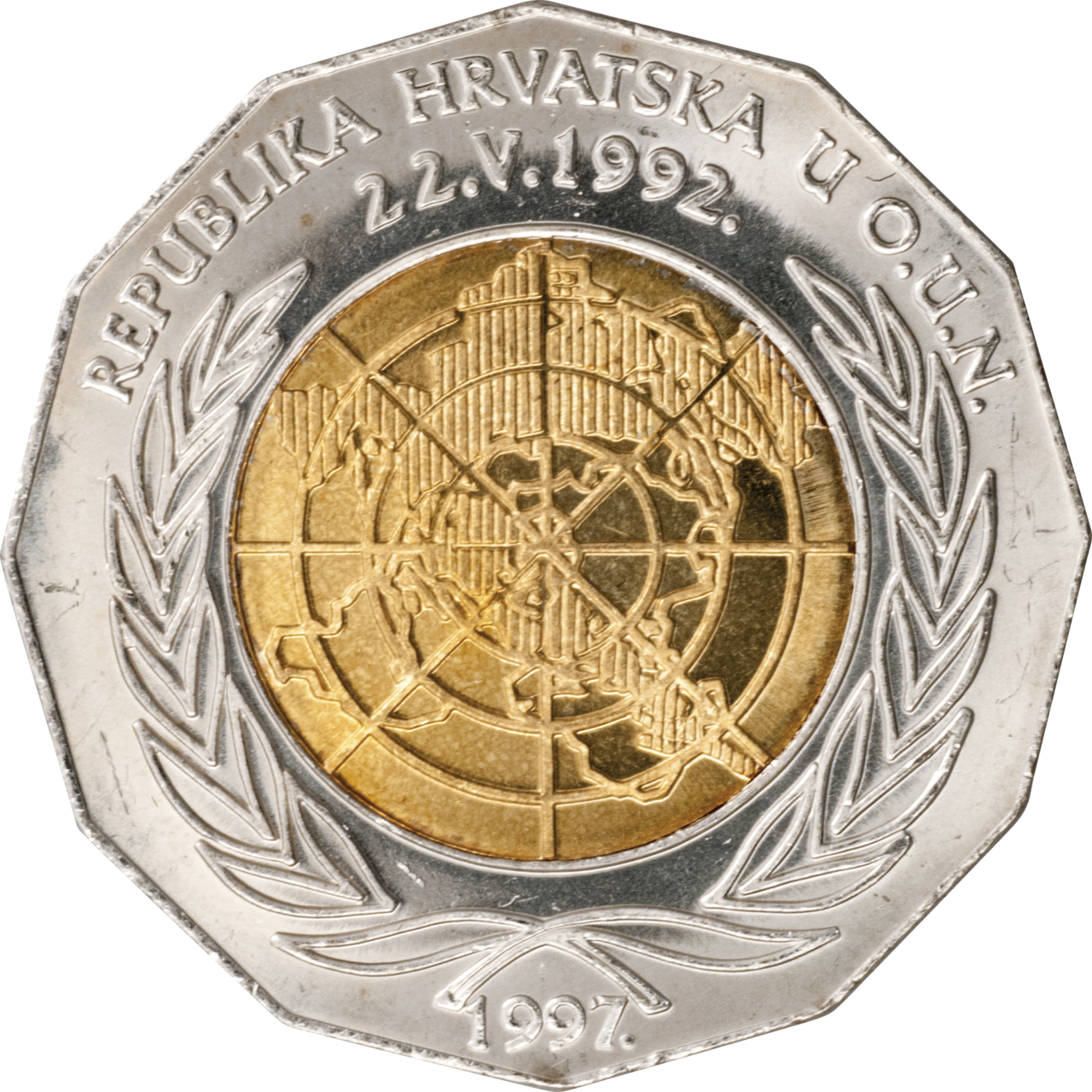 Motiv na licu: Unutar jezgre i prstena kovanog novca prikaz je znaka Organizacije ujedinjenih naroda, s tim da je unutar jezgre plošni prikaz planeta Zemlje, s posebno istaknutim reljefnim prikazom Republike Hrvatske. Prikaz unutar jezgre uokviren je stiliziranim grančicama masline, položenim unutar prstena kovanog novca. Iznad znaka, u dva retka, ispisan je tekst "REPUBLIKA HRVATSKA U O.U.N.", te nadnevak primanja Republike Hrvatske u Organizaciju ujedinjenih naroda "22. V. 1992.". Ispod znaka uz donji rub, u središnjem dijelu prstena kovanog novca, ispisana je brojčana oznaka godine kovanja "1997.".