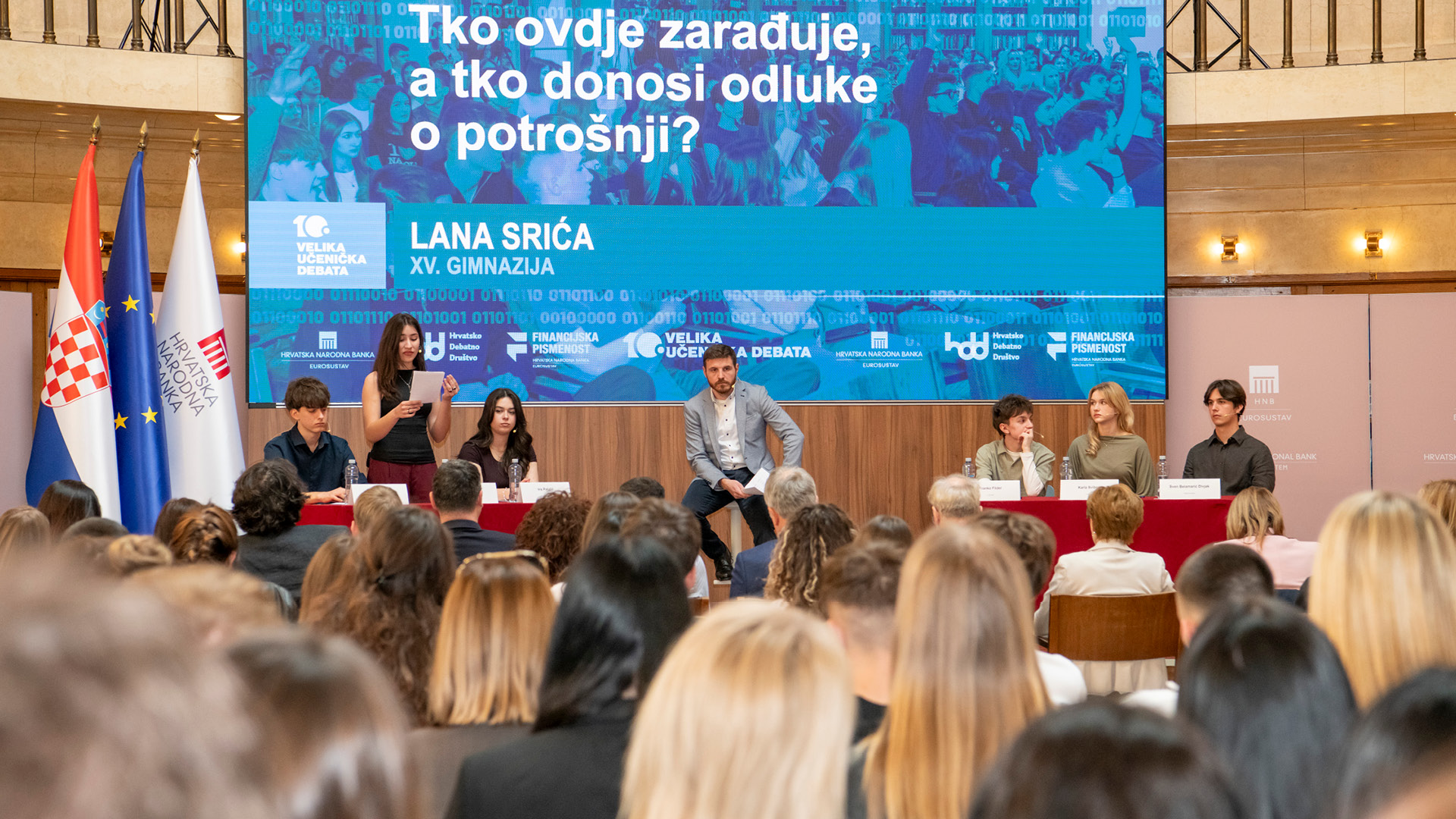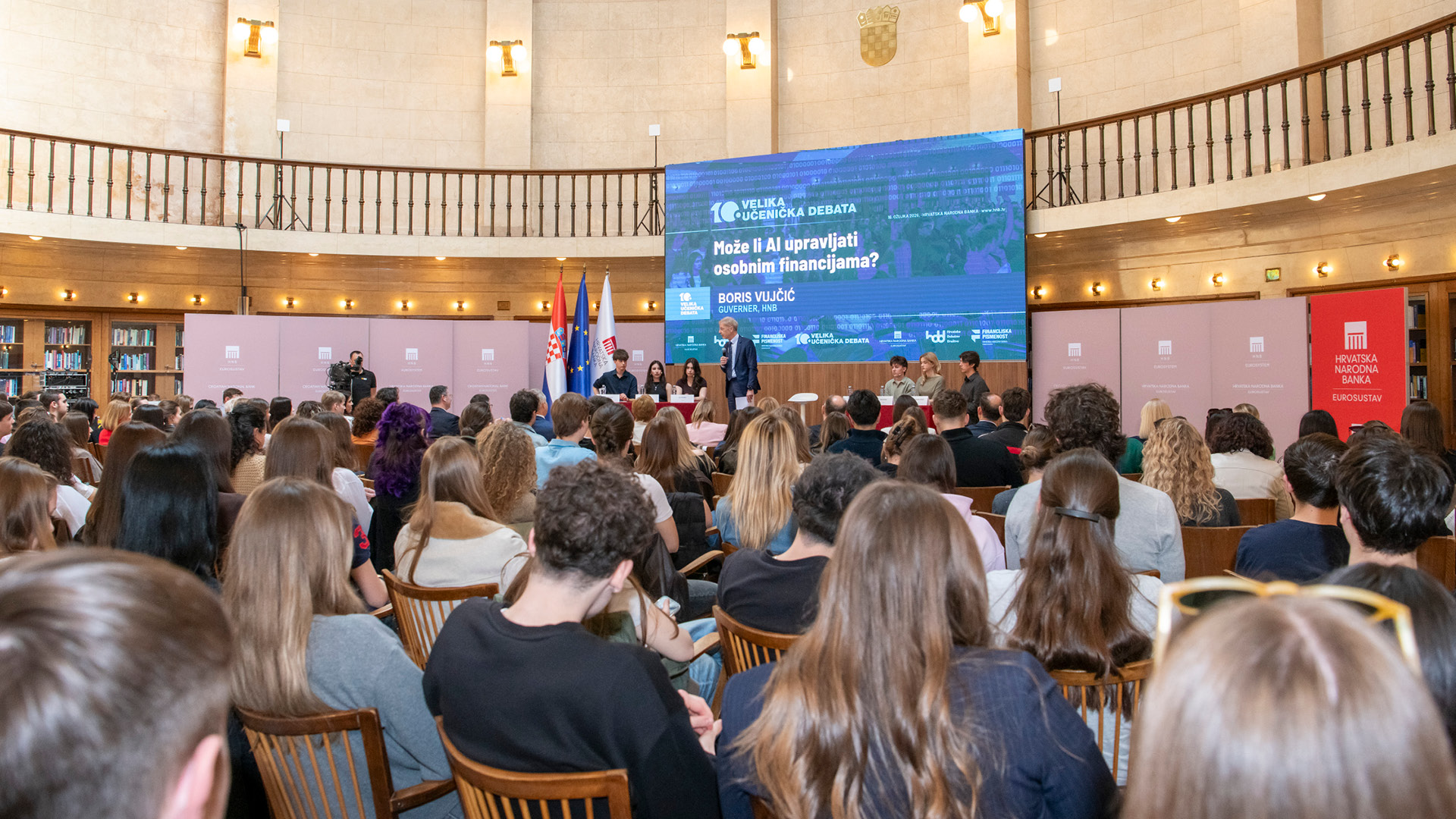 Hrvatska narodna banka organizirala je danas, u suradnji s Hrvatskim debatnim društvom, 10. Veliku učeničku debatu u Okrugloj dvorani glavne zgrade. Članovi Hrvatskoga debatnog društva raspravljali su na temu "Može li AI upravljati osobnim financijama?", a pridružilo im se više od 180 učenika i profesora iz 21 škole iz 16 hrvatskih gradova – Zaprešića, Virovitice, Varaždina, Čakovca, Rijeke, Opatije, Đurđevca, Požege, Slatine, Buzeta, Makarske, Splita, Nove Gradiške, Imotskog, Zagreba te iz Vele Luke s otoka Korčule, koji su aktivno sudjelovali u raspravi postavljajući pitanja. Sudionicima debate obratili su se guverner Hrvatske narodne banke Boris Vujčić i viceguverner Bojan Fras, a raspravi se pridružio i Toni Milun, ambasador financijske pismenosti.