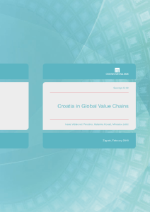 Global value chains have become a powerful source of increased efficiency and firm competitiveness. This paper explores Croatian participation in GVCs. Our results suggest that Croatia’s integration in GVCs did not essentially change from 2000 until 2014. Involvement in GVCs did not change in peer countries either, but they significantly increased their backward and decreased forward participation, while the structure of integration in Croatia stayed almost the same. In addition, the analysis of the structure of value added in exports in manufacturing sector shows that the share of domestic value added in gross exports in 2014 was high in the production of food, beverages and tobacco industry, pharmaceutical products, and computers and electronics. Moreover, the pharmaceutical industry is the only industry that significantly increased the share of domestic value added in exports from 2000 to 2014. Finally, our results indicate that Croatia is strongly integrated in GVC trade only with a few countries, with Germany being its most important GVC partner.