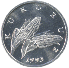 Motiv na naličju: U središnjem dijelu prikaz vrha kukuruzne stabljike iz koje se otvaraju dva dozrela klipa. Iznad prikaza, kružno uz rub, natpis "KUKURUZ" (lat. "ZEA MAYS"). Uz donji rub, u središnjem dijelu, godina kovanja.