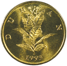 Motiv na naličju: U središnjem dijelu stilizirana stabljika duhana u cvatu. Iznad prikaza, kružno uz rub, natpis "DUHAN" (lat. "NICOTIANA TABACUM"). Uz donji rub, u središnjem dijelu, godina kovanja.