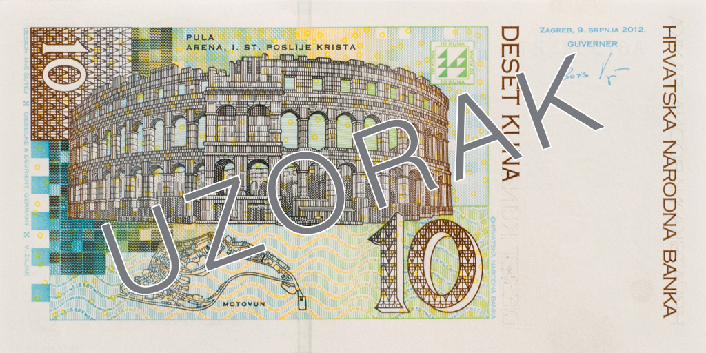 Osnovni motiv na naličju: Arena u Puli, tlocrt gradića Motovuna u Istri